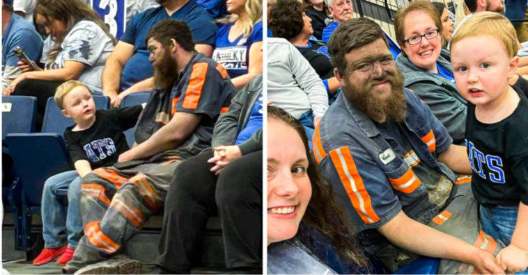 Наскоро снимка, направена по време на мач на баскетболния отбор на университета в Кентъки, обиколи социалните мрежи. На снимката се вижда фен с малкия си син, като мъжът е в мръсни работни дрехи, а ръцете и лицето му са покрити с въглищен прах.