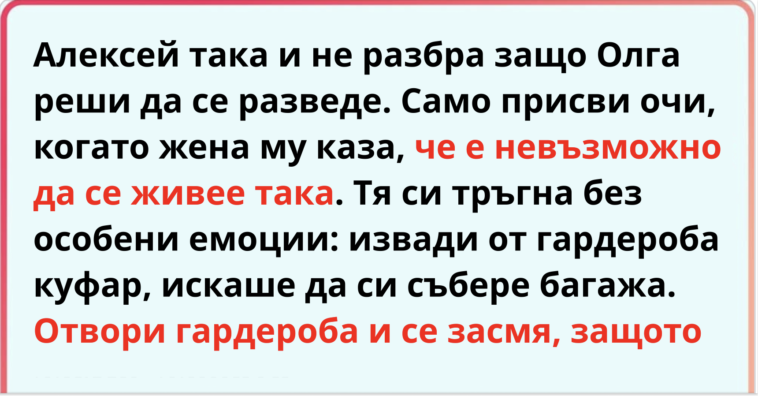 Алексей така и не разбра защо Олга реши да се разведе. Само присви очи, когато жена му каза, че е невъзможно да се живее така. Тя си тръгна без особени емоции: извади от гардероба куфар, искаше да си събере багажа. Отвори гардероба и се засмя, защото нямаше какво да опакова. Дори проклети чорапи за опаковане, наистина!