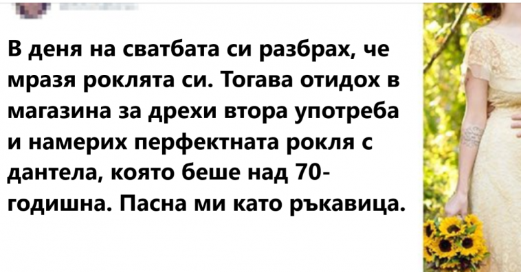 „В деня на сватбата си разбрах, че мразя роклята си. Тогава отидох в магазина за дрехи втора употреба и намерих перфектната рокля с дантела, която беше над 70 години. Пасна ми като ръкавица.“