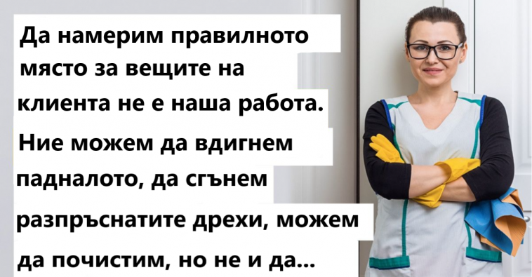 Тъй като нашата фирма е малка, почти семейна, клиентите често се обръщат към нас с нестандартни заявки. Това може да бъде заявка за ръчно измиване на ценни съдове, пресаждане на растения, разходка на кучето. Някои хора не правят разлика между почистващи услуги и личен асистент. Какво правим в този случай? Това зависи много от клиента. Имаме своите фаворити сред клиентите, за които сме готови да дадем най-доброто от себе си и няма проблем, ако поискат предварително, учтиво и срещу допълнително заплащане, да направим нещо друго. А има и такива, които вбесяват с отношението си. И разбира се, всички допълнителни искания, които не са записани предварително в договора и не са свързани с нашите преки отговорности, не се вземат предвид.