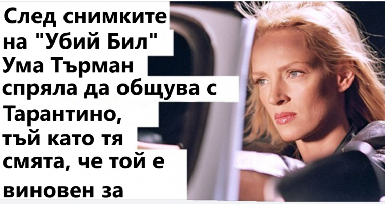 След заснемането на филма „Убий Бил“, Ума Търман спира да общува с Куентин Тарантино, тъй като го смятала за виновен за инцидента, който й се случил на снимачната площадка. Актрисата поискала каскадьор, който да управлява колата, но Тарантино я уверил, че няма причина за безпокойство. В резултат на това Ума загубила управление и се блъснала в дърво, получила мозъчно сътресение и наранявания на коленете.