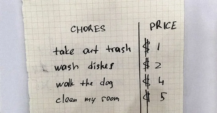 Уесли се усмихна триумфално. „Мислил съм за това. За изнасяне на боклука – 1 долар, за миене на чинии – 2 долара, за разхождане на кучето – 4 долара, за почистване на стаята ми – 5 долара, а за почистване на двора и косене на тревата – 10 долара. И имаш късмет, че не искам да ти платя обратно“.