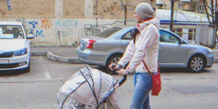 Едно от колелата на количката беше паднало и жената сякаш се опитваше да го бутне обратно на мястото му, докато бебето й виеше в знак на протест в изкривената количка.