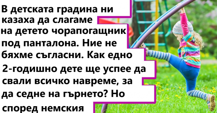 - В детската градина ни казаха да слагаме на детето чорапогащник под панталона. Протестирахме: как едно 2-годишно дете може да свали всичко навреме: панталони, чорапогащници, бельо, за да седне на гърнето? Оказа се, че според немския метод просто трябва да „обелите“ детето като лук, когато дойде сутринта в детската градина: сваляте гащеризона, панталона и го оставяте само по чорапогащник. Това изглежда доста рационално.