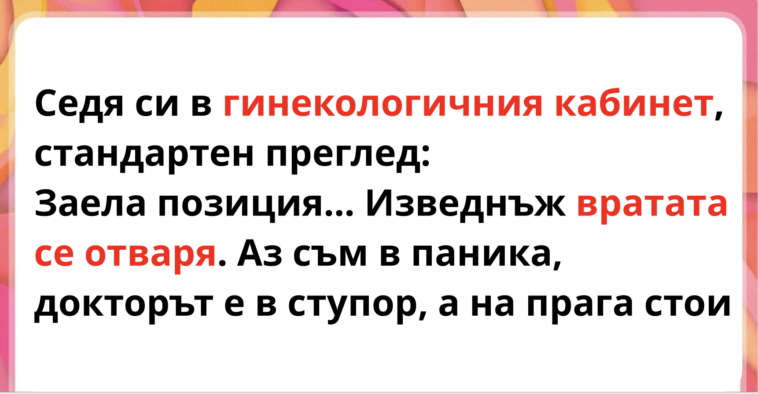 Седя си в гинекологичния кабинет, стандартен преглед: краката в стремената, лекарят в ход… Изведнъж вратата се отваря. Аз съм в паника, докторът е в ступор, а на прага стои разносвач на пица. Оказва се, че сестрите са поръчали храна и са му казали да я занеса в салона. Човекът е сбъркал вратата и е нахлу направо на срещата ми. Очите му бяха побелели, обърна се рязко и изскочи навън. Мисля, че беше по-смутен от мен.