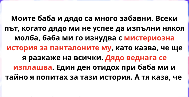 Моите баба и дядо са много забавни. Всеки път, когато дядо ми не успее да изпълни някоя молба, баба ми го изнудва с мистериозна история за панталоните му, като казва, че ще я разкаже на всички. Дядо веднага се изплашва. Един ден отидох при баба ми и тайно я попитах за тази история. А тя каза, че вече цяла година не си спомня никаква история, но това помага и е нормално. По-късно със същия въпрос се обърнах към дядо ми и чух същия отговор, че не си спомня историята, но в случай на нещо срамно. Ето така живеят те. А изнудването с панталони е в сила от 2 години.