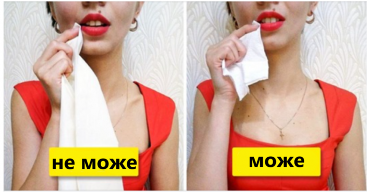 Както знаете, ленената салфетка се поставя на коленете ви, а също така е позволено леко да докоснете устата си с нея по време на хранене. Изключително нежелателно е да правите това, ако имате червило по устните. Салфетка, зацапана с червило, е признак на ужасно лошо възпитание. Използвайте хартиени салфетки, ако е необходимо, помолете сервитьора да ги донесе.