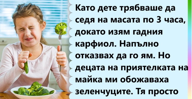 Като дете трябваше да седя на масата по 3 часа, докато изям гадния карфиол. Напълно отказвах да го ям. Но децата на приятелката на майка ми обожаваха зеленчуците. Тя просто слагаше храна в чинията си и не я предлагаше на децата. И когато поискат да опитат, тя неохотно отговаряше: „Това е храна за възрастни. Но мога да ти дам малко.“