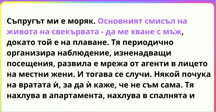 Съпругът ми е моряк. Основният смисъл на живота на свекървата – да ме хване с мъж, докато той е на плаване. Тя периодично организира наблюдение, изненадващи посещения, развила е мрежа от агенти в лицето на местни жени. И тогава се случи. Някой почука на вратата ѝ, за да ѝ каже, че не съм сама. Тя нахлува в апартамента, нахлува в спалнята и хваща сина си там. Който се беше върнал по-рано, без да ѝ каже, за да може да бъде с мен без досадните посещения на майка му, която остава при нас практически денонощно.