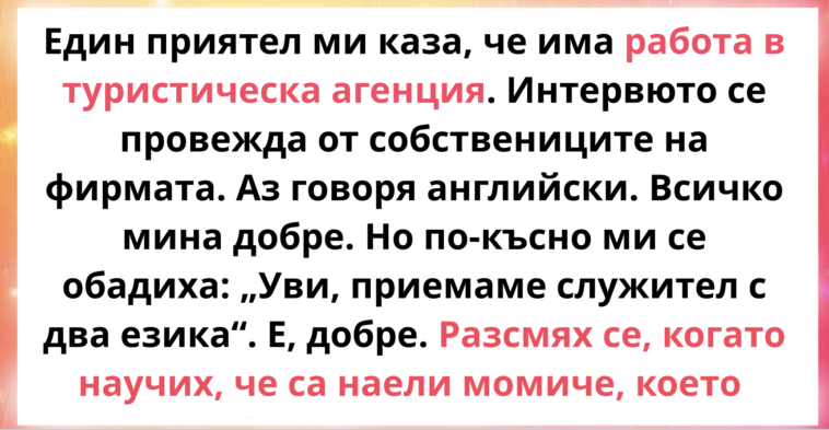 Един приятел ми каза, че има работа в туристическа агенция. Интервюто било проведено от собствениците на фирмата – две жени. Аз говоря английски, компютър. Всичко мина добре. Но по-късно ми се обадиха обратно: „Уви, приемаме служител с два езика“. Е, добре. Разсмях се, когато научих, че са наели момиче, което не знае нито един чужд език, а за мен са казали: „Вземете такъв човек, той ще повлече бизнеса към себе си“. Оттогава не знам как да се държа правилно на интервю.