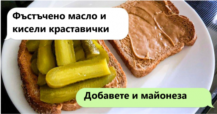 Фъстъченото масло обикновено се свързва с десерт, но може да се комбинира дори с кисели краставички. Рецептата за този сандвич беше публикувана за пръв път в The New York Times и тя раздели читателите на 2 лагера. Някои го смятат за подигравка, но други са сигурни, че маринатата от краставици омекотява мазното фъстъчено масло. Сандвичът вече е спечелил титлата на непризната кулинарна класика, а някои препоръчват да се добави майонеза.