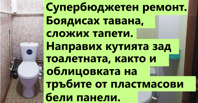 „Супербюджетен ремонт. Боядисах тавана, сложих хартиени тапети. Направих кутията зад тоалетната, както и облицовката на тръбите от пластмасови бели панели.“