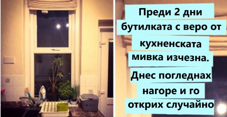 „Преди 2 дни бутилката с веро от кухненската мивка изчезна. Днес погледнах нагоре и го намерих случайно.“