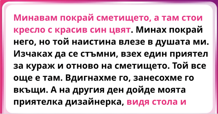 Минавам покрай сметището, а там лежи един стол с красив син цвят. Минах покрай него, но той наистина влезе в душата ми. Изчаках да се стъмни, взех един приятел за кураж и отново на сметището. Той си стои там. Вдигнахме го, занесохме го вкъщи. А вдругиден дойде моята приятелка дизайнерка, видя стола и като слюнка започна да слюноотделя! Оказа се, че това е италиански дизайнерски стол от 70-те години на миналия век. Струва много пари.