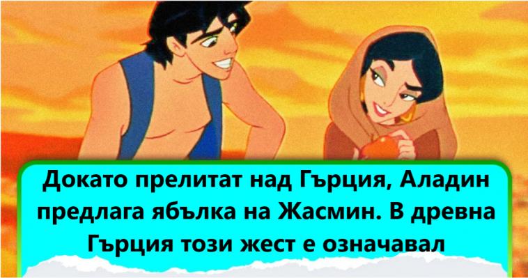 13. „Докато прелитат над Гърция на вълшебното килимче, Аладин предлага ябълка на Жасмин. В древна Гърция този жест е означавал предложение за брак“