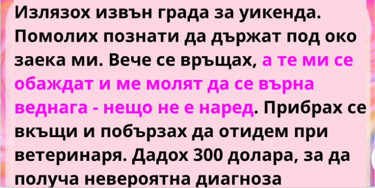 Излязох извън града за уикенда. Помолих познати да държат под око заека ми. Вече се връщах, а те ми се обаждат и ме молят да се върна веднага – нещо не е наред. Прибрах се вкъщи и побързах да отидем при ветеринаря. Дадох 300 долара, за да получа невероятна диагноза – зайчето ми е естествена кралица на драмата. Отказваше храна и беше тъжна, не