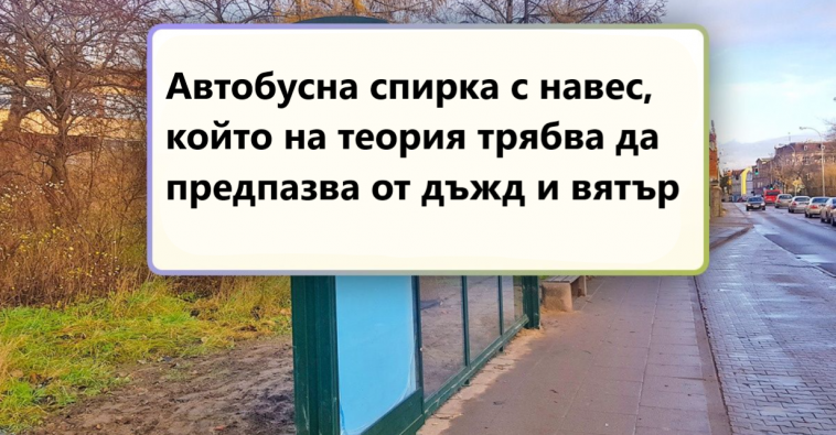 1. Автобусна спирка с навес, който на теория трябва да предпазва от дъжд и вятър.