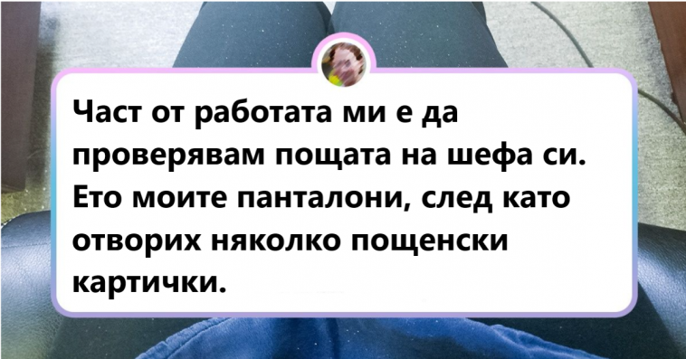„Част от работата ми е да проверявам пощата на шефа си. Ето моите панталони, след като отворих няколко пощенски картички. Сериозно, защо са с брокат!?“