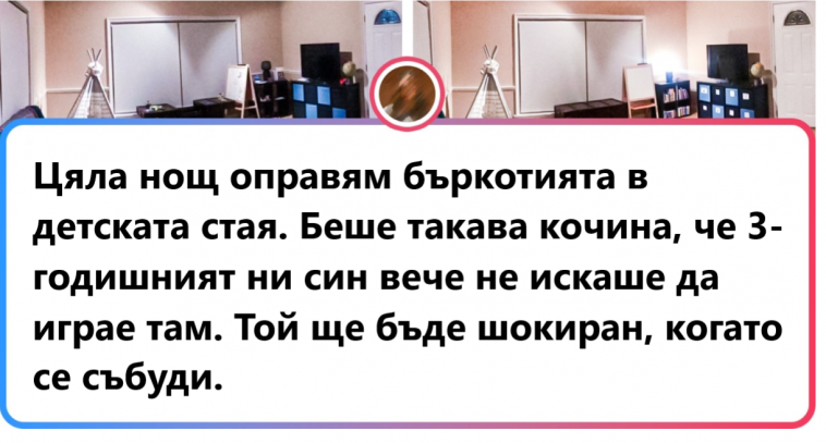 „Цяла нощ оправям бъркотията в детската стая. Беше такава кочина, че 3-годишният ни син вече не искаше да играе там. Той ще бъде шокиран, когато се събуди.“