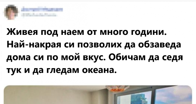 „Живея под наем от много години. Най-накрая си позволих да обзаведа дома си по мой вкус. Обичам да седя тук и да гледам океана.“